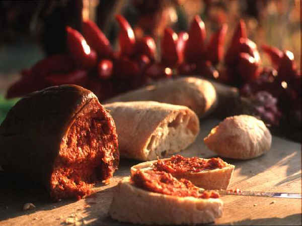 famosa quella di Spilinga, uno degli insaccati più famosi in Italia. E' una salsiccia particolarissima, tenera, tanto da essere spalmata sul pane, preparata con le parte del maiale più delicate (sottopancia, testa e coscia) aromatizzate con abbondante peperoncino. La soppressata ed il capocollo calabresi sono rinomati: il primo si prepara con la parte più magra della coscia e del filetto, mentre per il capocollo si preferisce testa e filetto. Si tratta in pratica di due salumi magri (certo... magri quanto può esserlo una specialità del maiale!). Con la parte più grassa si preparano le gustosissime salsicce rosse piccanti, ideali per aromatizzare il sugo, sminuzzate nella pasta. Il lardo e le altre parti grasse vengono utilizzate per preparare i frigulimiti, aromatizzati con la salvia. Si tratta di una leccornia, ideale da spalmarsi sul pane o da utilizzare come base di sughi per la pasta.